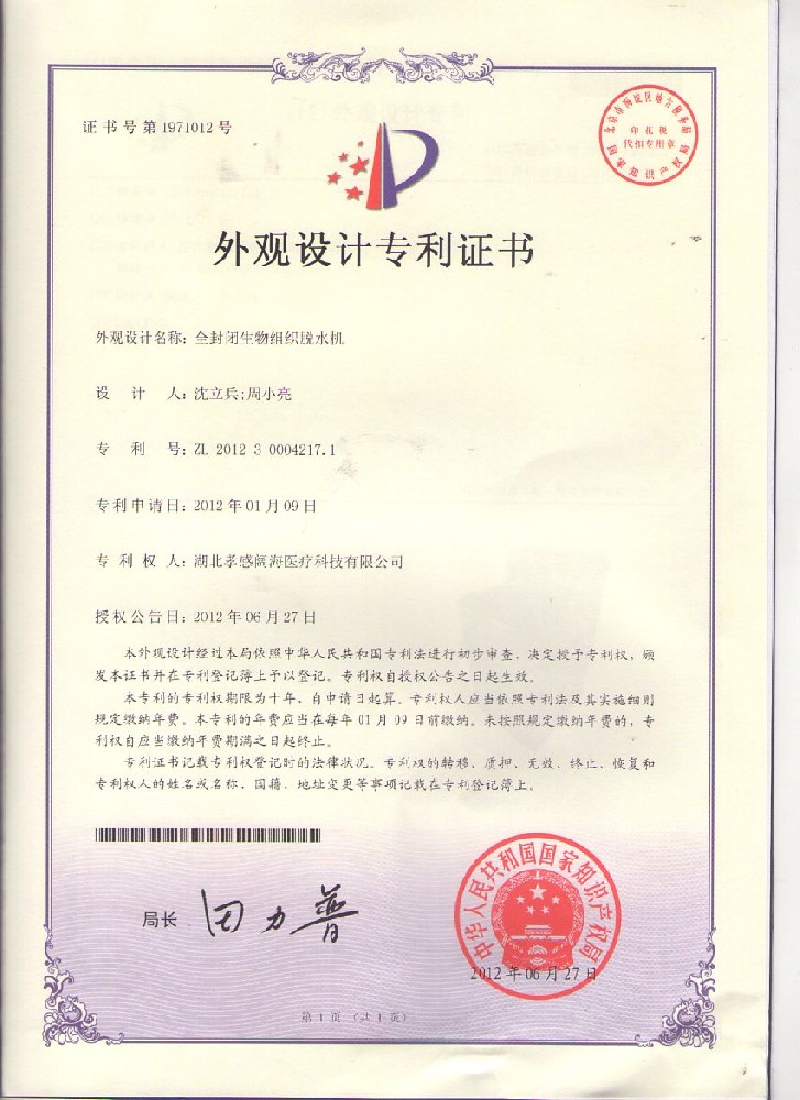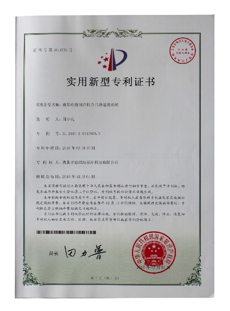 抽(chou)真空(kong)全封閉脫水(shui)機專利證書(shu) 液基細胞制(zhi)片(pian)專利證書(shu)01