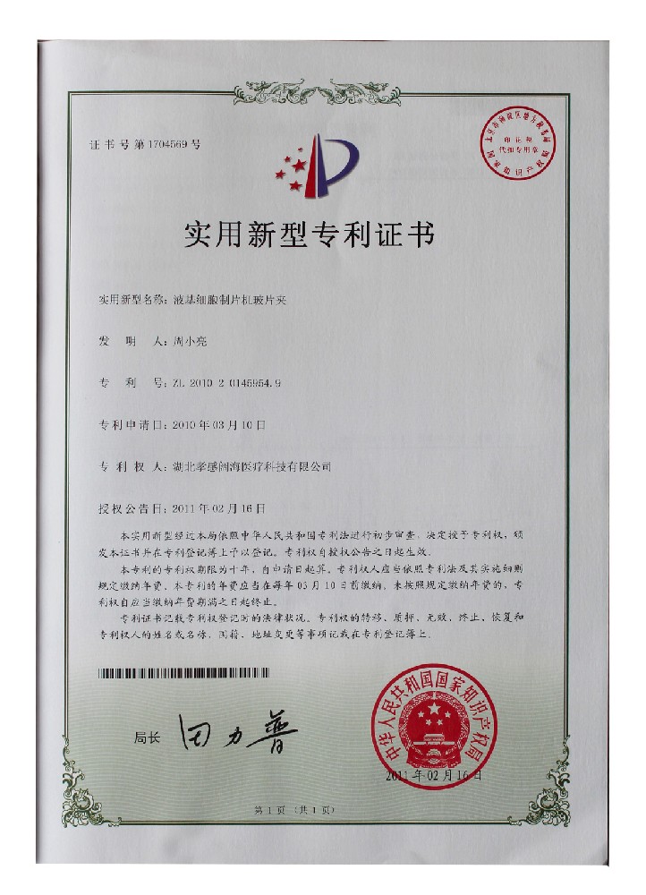 液基細(xi)胞制(zhi)片專利證(zheng)書02 液基細(xi)胞制(zhi)片專利證(zheng)書03