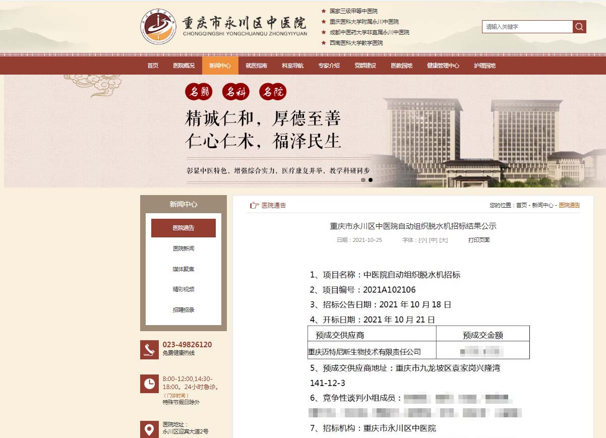闊海自動組織脫水機中標重慶市永川區中醫院