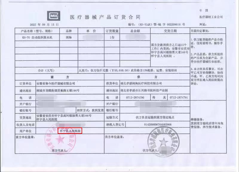 闊海全自動封閉式組織脫水機中標安慶市立醫院懷寧院區